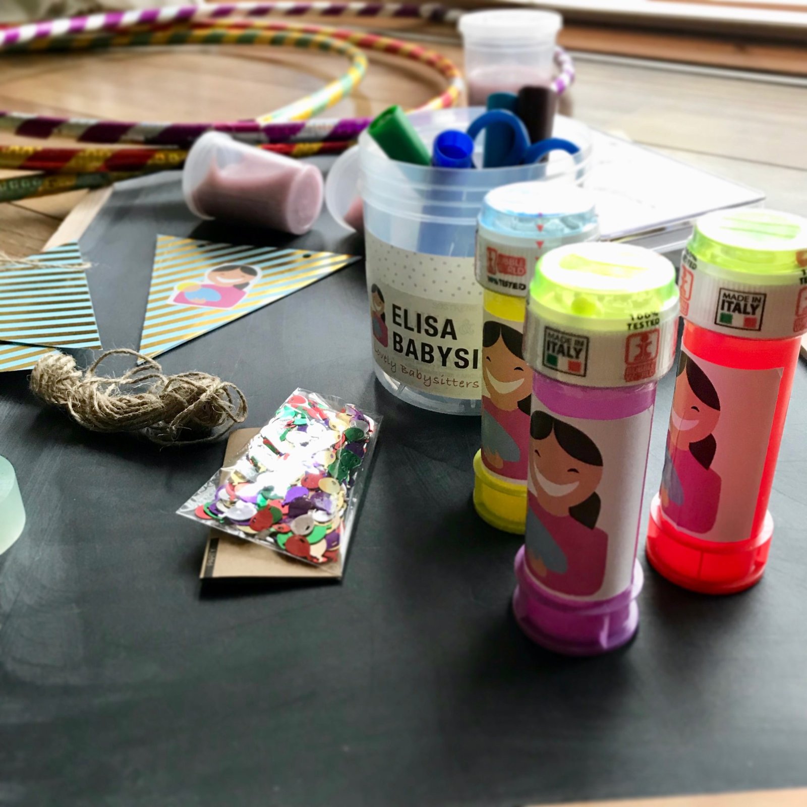 Thanks a million to Esther who helped me over these days, she was responsible for the materials, arts and crafts workshops. At the Elisa Babysitting events we provide everything, and more is needed to turn any room into a fun and colourful playground for kids.